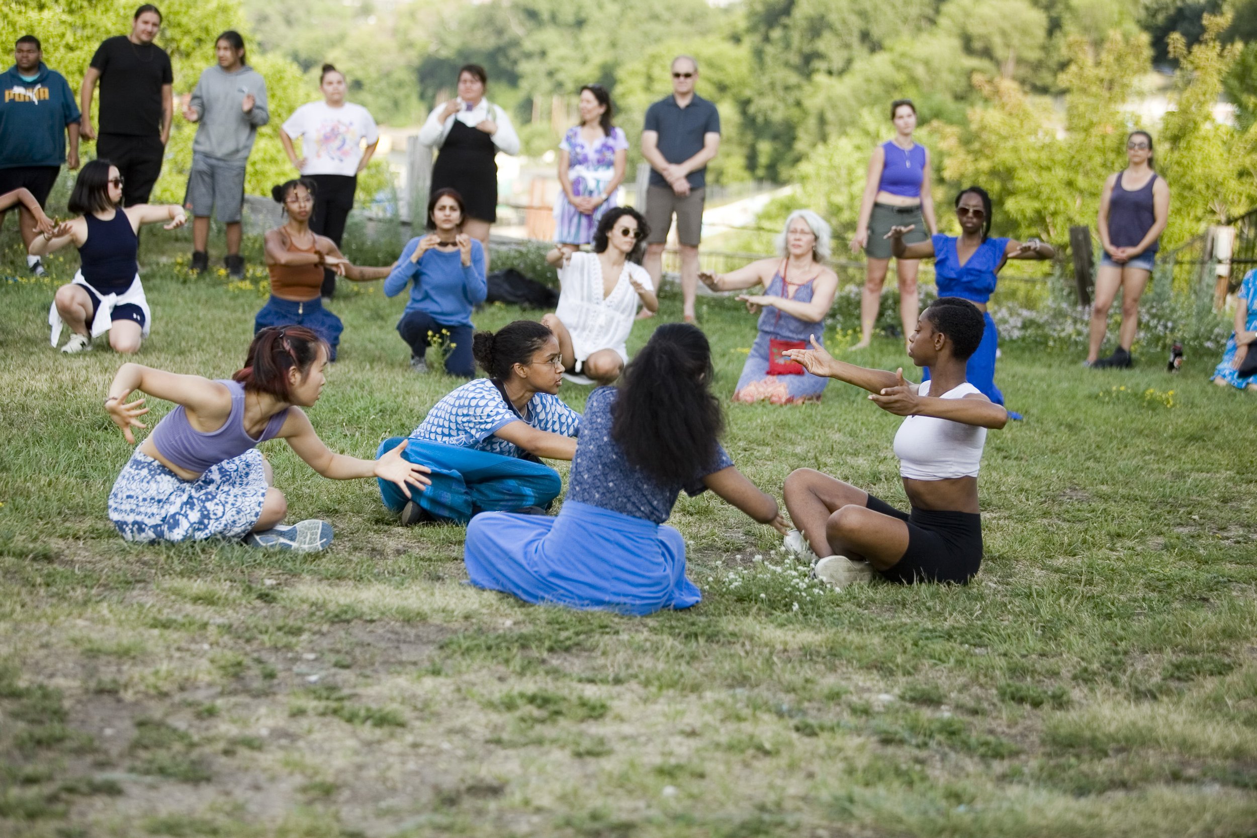 This is where we gather in joy and community, training together, developing our work, rehearsing for performances, facilitating workshops and community events, and teaching weekly classes and our Summer Intensive. Established in 2018, the Institute sits at the vibrant confluence of the Hamline-Midway, Rondo, and Frogtown neighborhoods. We share a building with a Black-owned day care and a Somali restaurant; Gordon Parks ALC High School and the charter High School for Recording Arts are across the street; the Lexington Avenue Green Line stop is just a block away. Once a used car salesroom, the building is now refurbished with floor to ceiling windows, a sprung floor dance studio, an access ramp, two ADA-compliant all-gender bathrooms, a kitchenette, and an office/meeting space. Works of visual art, donated by and created by community members, surround us as we dance.
